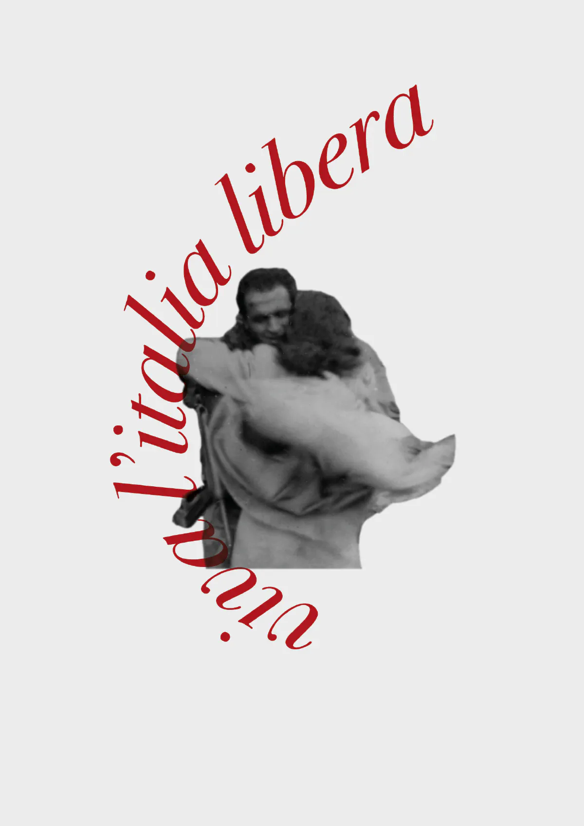 “Viva l’Italia libera” un grido che ancora oggi rappresenta i valori di libertà, giustizia e solidarietà. Il manifesto rievoca la forza di abbracciarsi senza paura. Il lettering si lega alle figure come in un abbraccio.