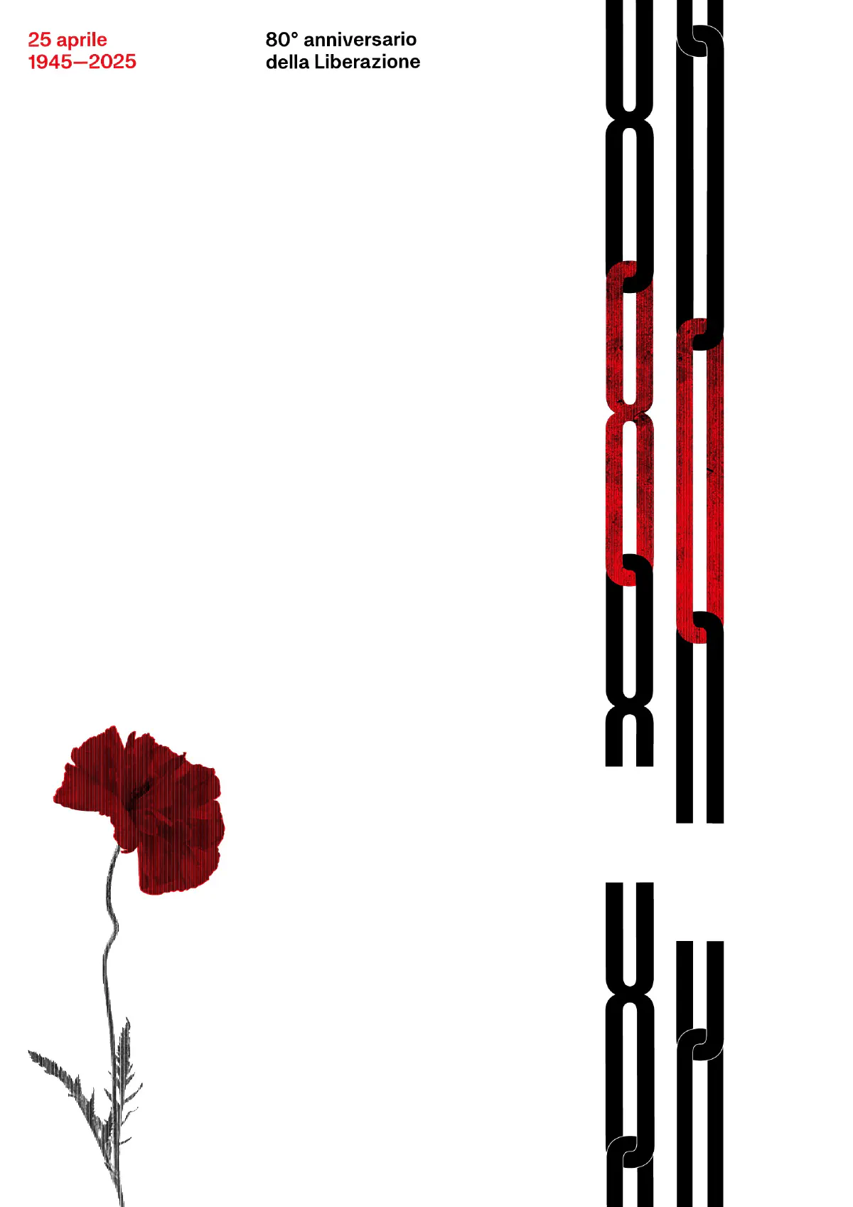 Catene che si spezzano evocano il passaggio dalla costrizione alla libertà. Gli anelli, ora sciolti, diventano segno di unione e memoria: dall’intreccio prende forma il numero 80, cifra viva di una ricorrenza che unisce passato e presente. Un papavero affiora silenzioso, simbolo della Resistenza, a ricordare che la libertà è frutto di lotta e impegno civile.