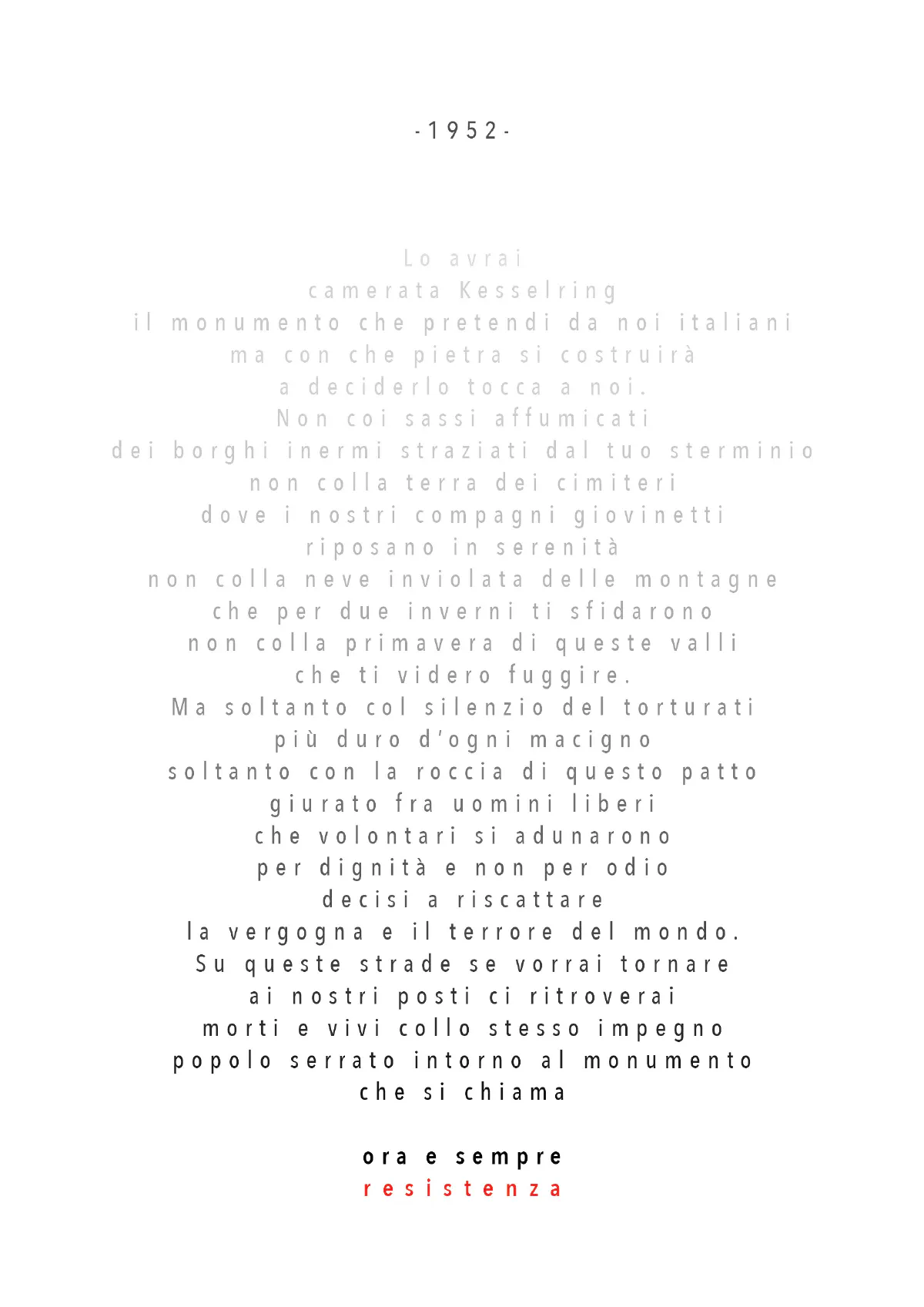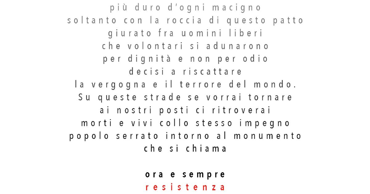 Il componimento di Piero Calamandrei, rappresentato in questo manifesto attraverso varie tonalità di grigio, vuole ricordare l’importanza della Resistenza, inoltre, distinguere con il nero e il rosso il verso finale: «ora e sempre resistenza», mira a scolpirlo nella memoria di ciascuno.