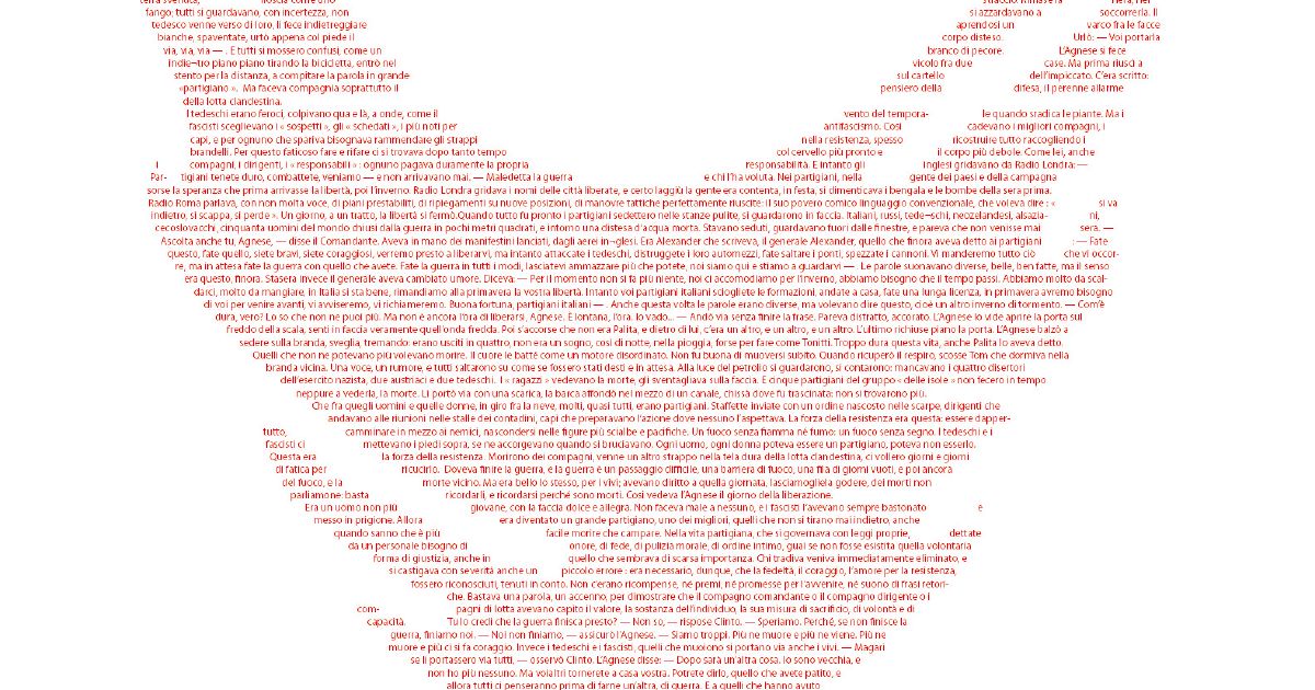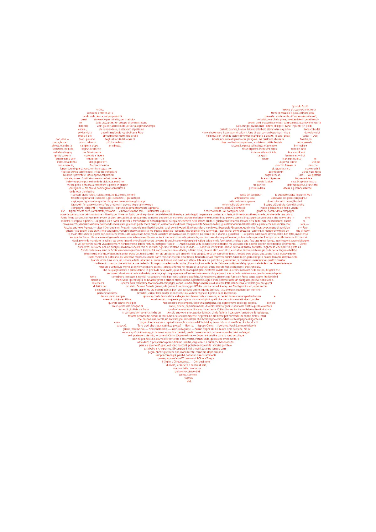 Nel romanzo L’Agnese va a morire (1949) Renata Viganò narra la vita e la lotta partigiana. Sempre presente, lungo tutta la narrazione, il richiamo al fazzoletto che cinge la testa della protagonista, riportato qui con il colore rosso, per omaggiare coloro i quali hanno dato la vita per la nostra libertà.